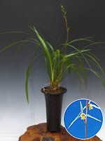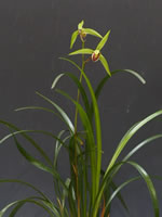 花は小輪の緑三角咲き花間広く葉上に抜ける。あまり見かけない品種。 |